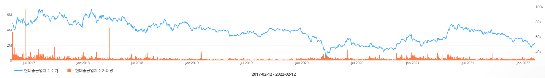 아래는 최근 5년의 주가와 거래량을 그래프로 표현한 것입니다. 주가는 오르내리기를 반복하는 중인 것 같습니다. 최근에는 지속적으로 하락하다가 약간 반등하는 모습을 보이고 있습니다.